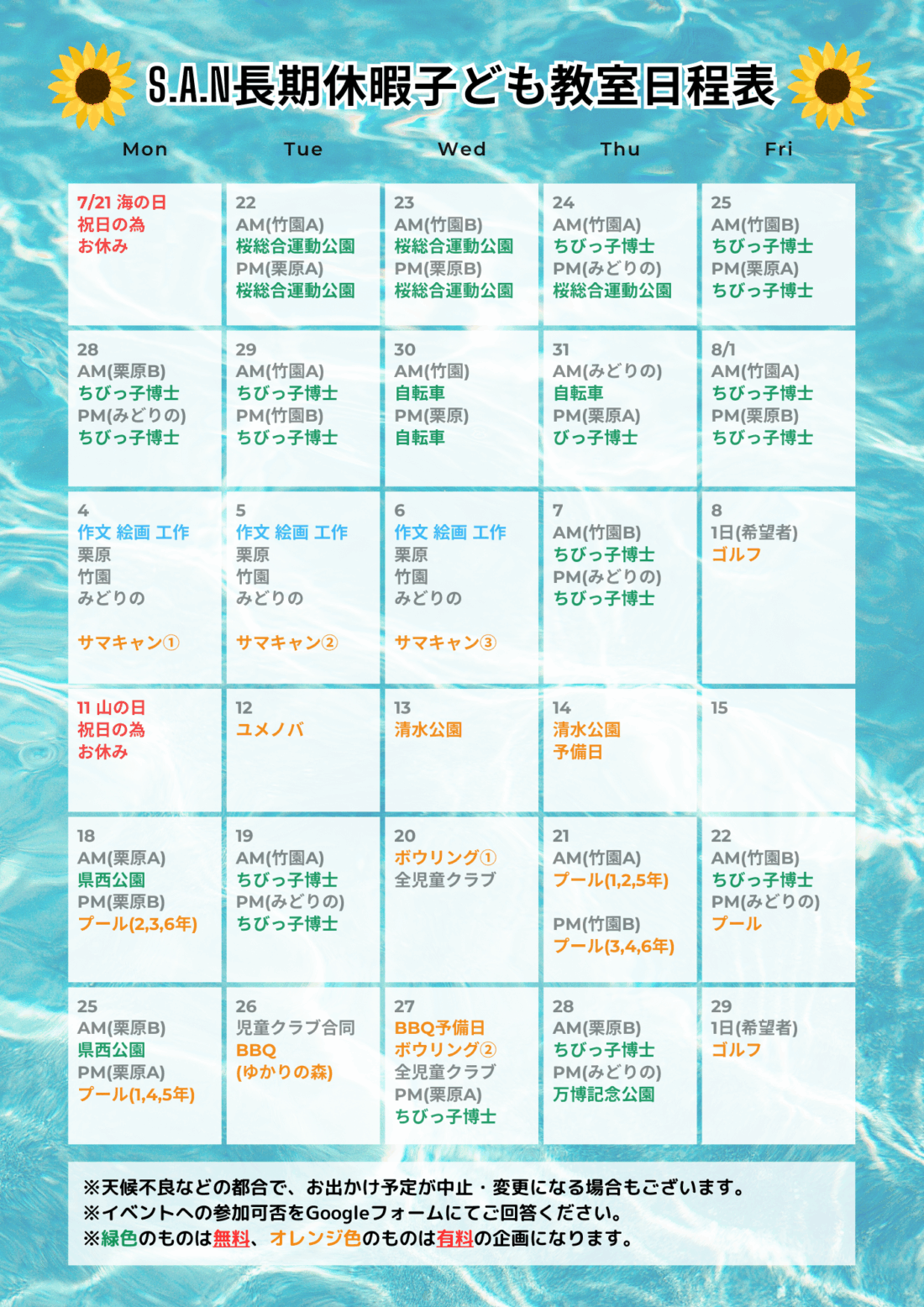 長期休暇子ども教室の日程表がすべて確定いたしました。
